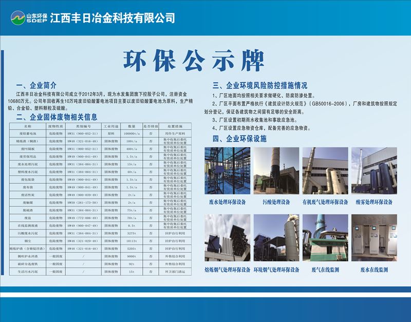 江西豐日冶金科技有限公司江西豐日冶金科技有限公司成立于2012年3月,注冊資金15000萬元,現(xiàn)為山東環(huán)保集團(tuán)旗下控股子公司,落戶于江西省宜春市袁州醫(yī)藥工業(yè)園。公司年回收再生十萬噸廢舊鉛酸蓄電池項(xiàng)目占地62.41畝,總建筑面積42180㎡,總投資3.5億元,于2020年5月份投入生產(chǎn),自生產(chǎn)以來運(yùn)行穩(wěn)定,年產(chǎn)值達(dá)10億元以上,年納稅1億元以上。